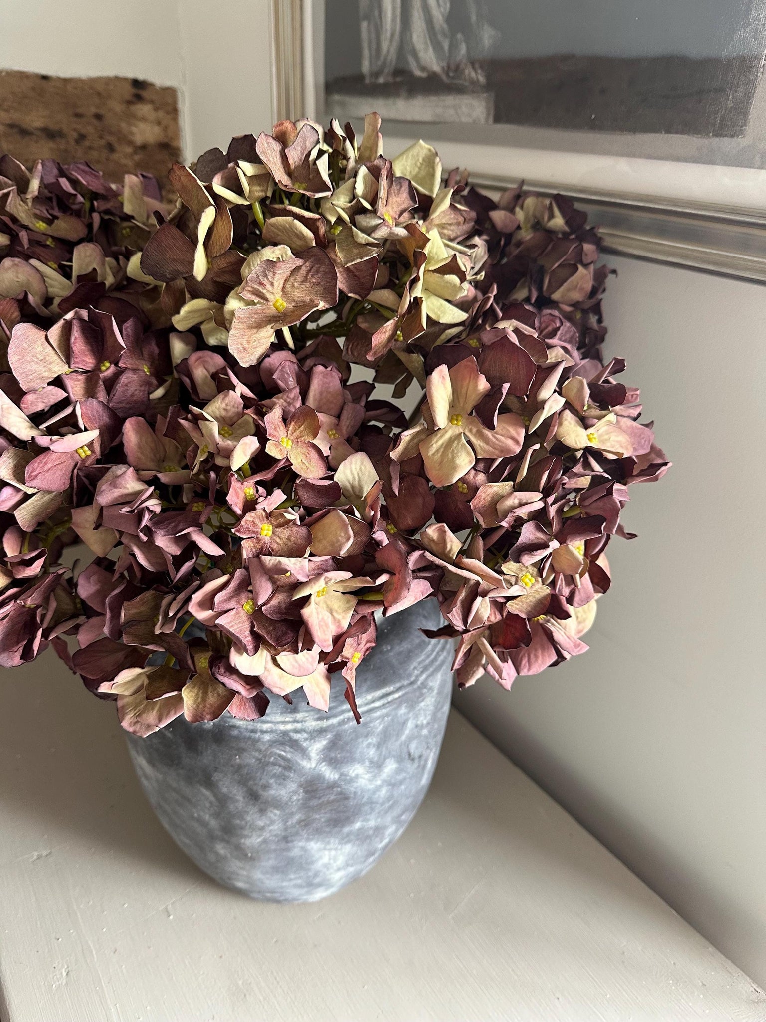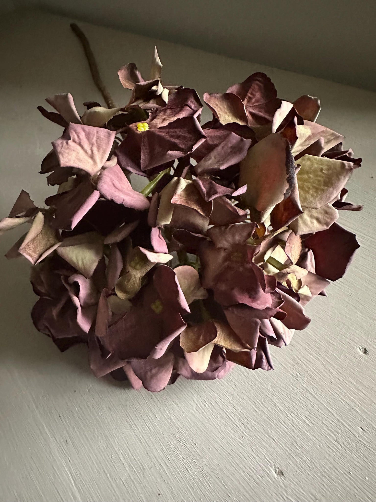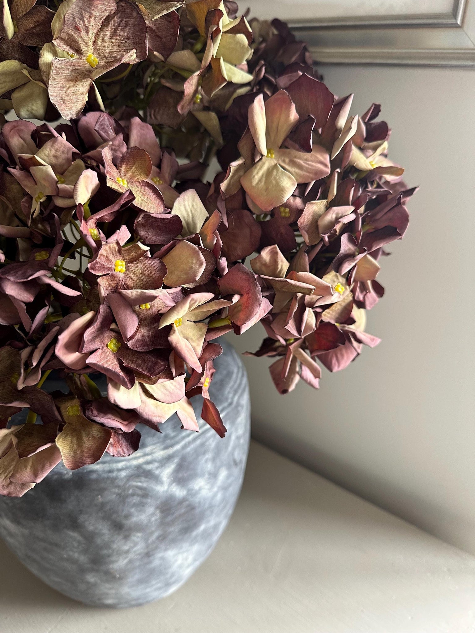 Discover timeless elegance with our Faux Hydrangea in a Vintage Mulberry colour, meticulously crafted with beautifully ruffled petals, to mimic the look of a naturally dried Hydrangea. Add a touch of everlasting beauty to your home decor with these faux hydrangea flowers, perfect for any interior or vintage style wedding.