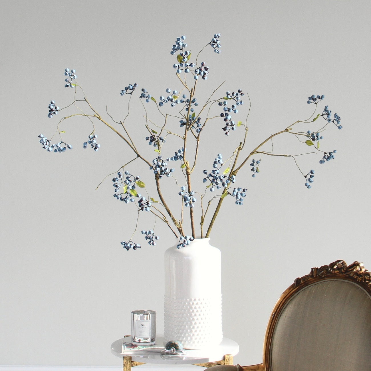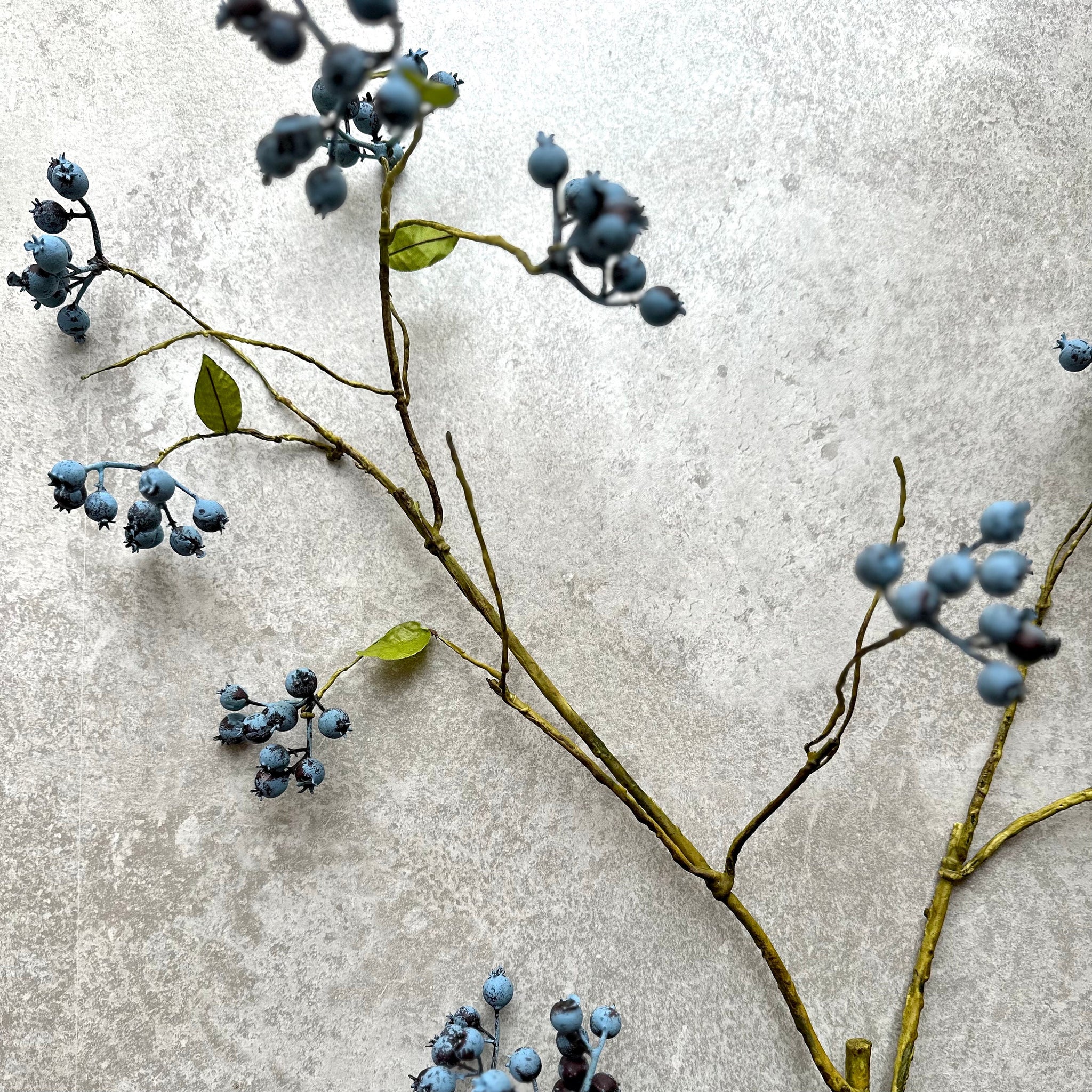 With hundreds of realistic blueberries on each stem, this stunning blueberry spray branch includes a touch of silver/white on the berries creating incredibly lifelike clusters. These artificial blueberries are perfect for adding texture and depth to a faux flower bouquet