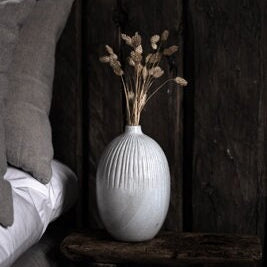 Tall ceramic vase with a glossy finish. It has a neutral colour and soft lines that gracefully and easily enhance all types of settings and environments. Perfect for dried flowers & grasses to create a boho look.