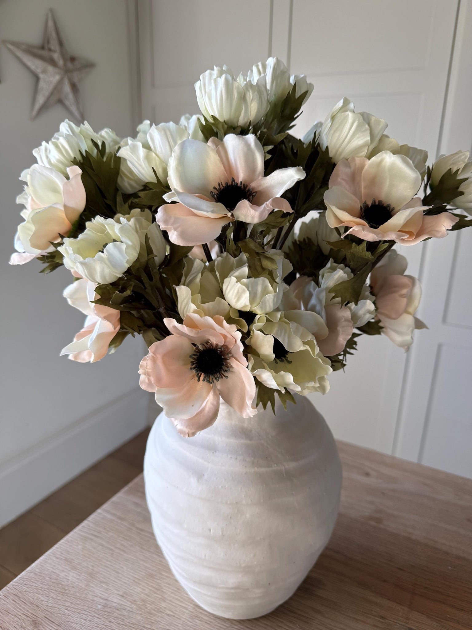 This stunning faux Anemone flower is an incredibly realistic example of the variety "Mistral Bianco Centro Nero" with its creamy white, blush pink, tinted petals, and striking black centres. The perfect flower for a blush pink themed Spring Wedding or party or a simple spring flower arrangement.