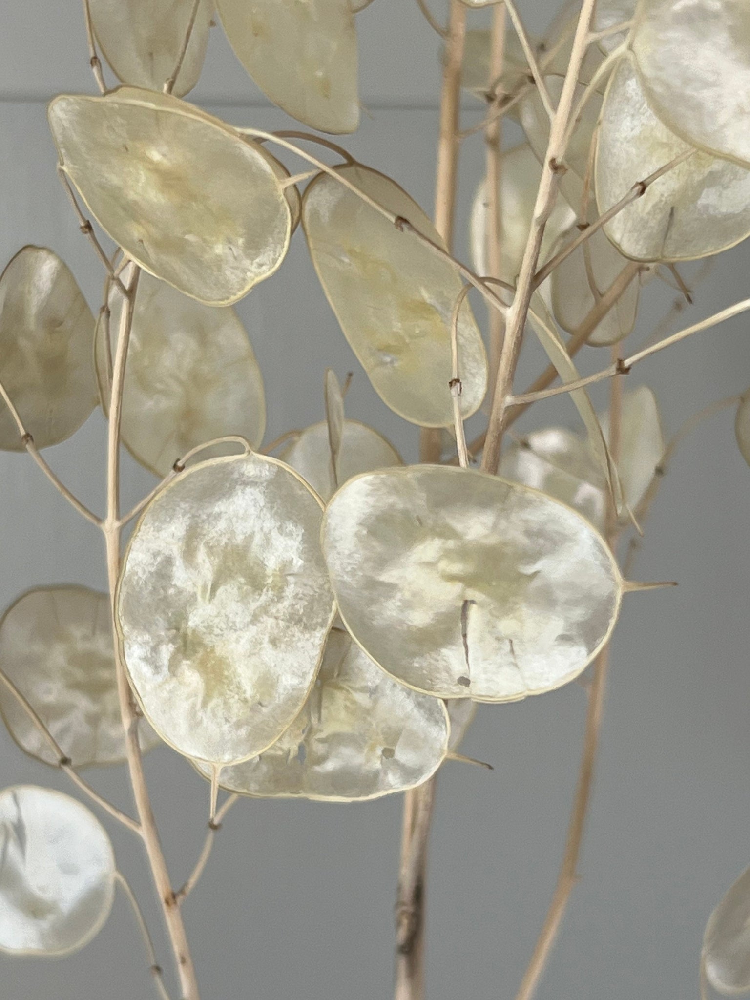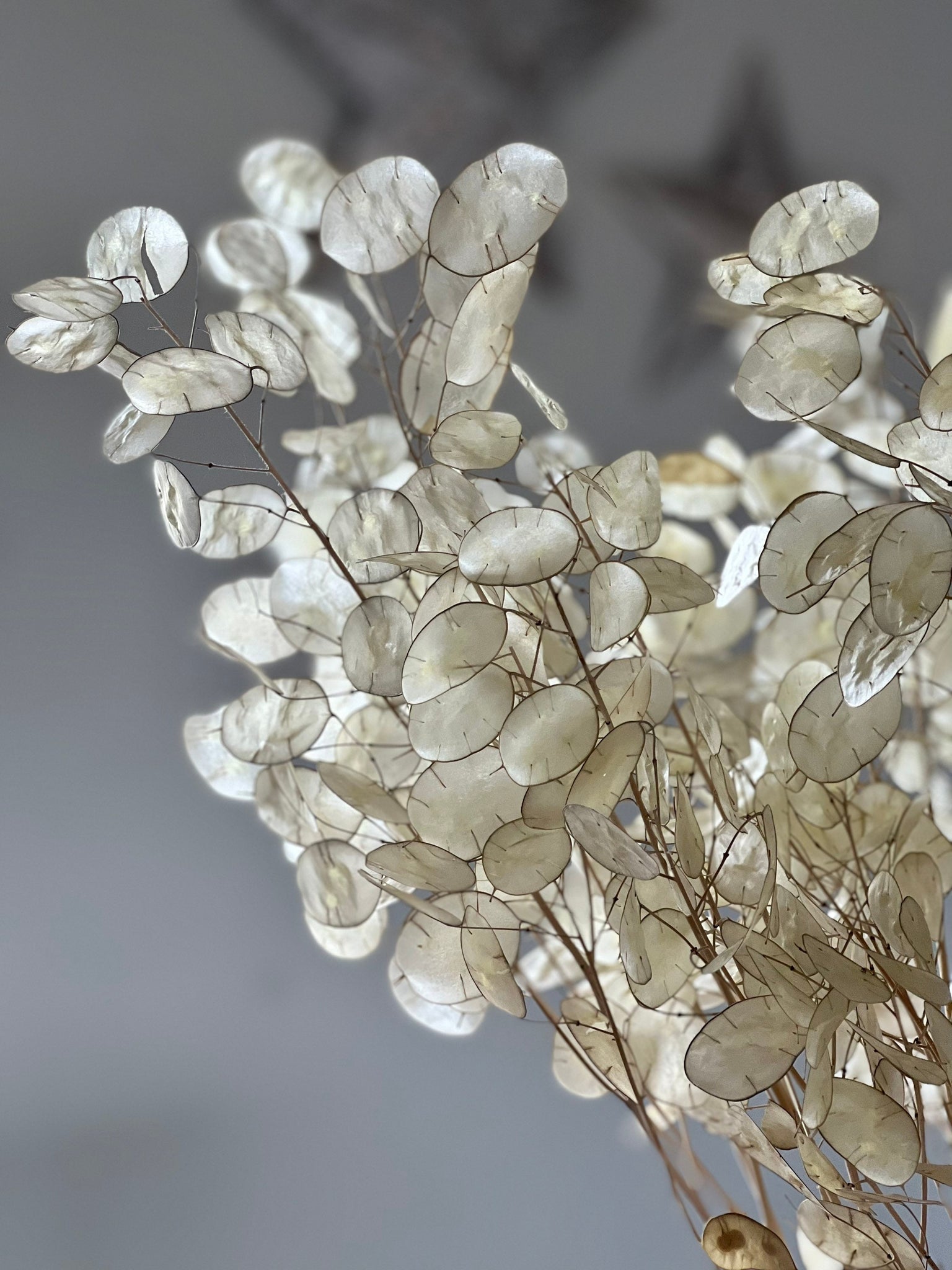 This beautiful dried Lunaria or sometimes known as Honesty, Silver Dollar, Moneywort or Money Plant was grown from seed in our own cutting garden here at Botanica. The seed pods were harvested at the end of June 2025 and naturally air dried and bleached by the sun in our greenhouse. Each seed pod was then peeled by hand to reveal the gorgeous translucent pearly discs beneath. ( Bunches of unpeeled Lunaria are also available)